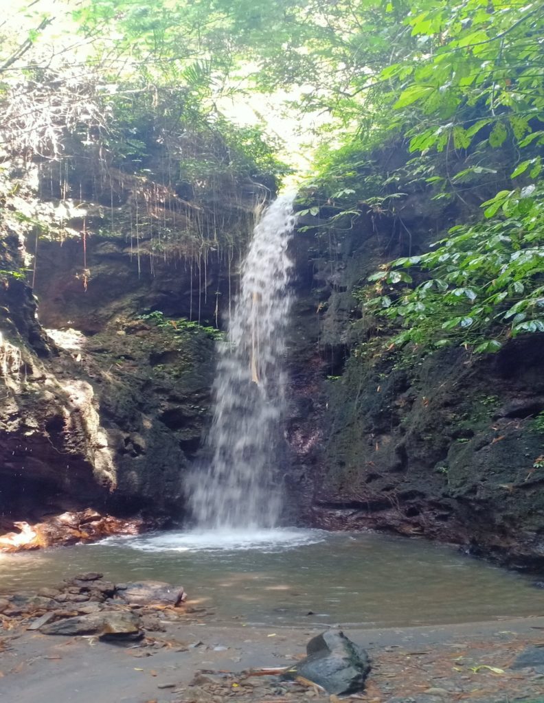 Op de hoofdweg linksaf, en na 1 kilometer weer links, deze weg is net nieuw geasfalteerd, iets naar beneden rijden en dan staat er een bordje met waterfall aangegeven. Het zandpaadje op en na 800 meter linksaf. Als het droog is geen probleem, doorrijden tot bij de waterval. Hier kun je een donatie geven en zo nodig een gids vragen om je te begeleiden (je sponsort de lokale mensen hier mee). De Waterval is circa 12 meter hoog, een leuke wandeling er naartoe en achteraf lekker koffie drinken bij deze vriendelijke mensen. Tijdens het gesprek krijgen we te horen dat er weinig toeristen meer komen. Waarom? Mogelijk omdat hier in 1996 een grote landslide heeft plaats gevonden, waarbij 34 mensen het leven lieten.